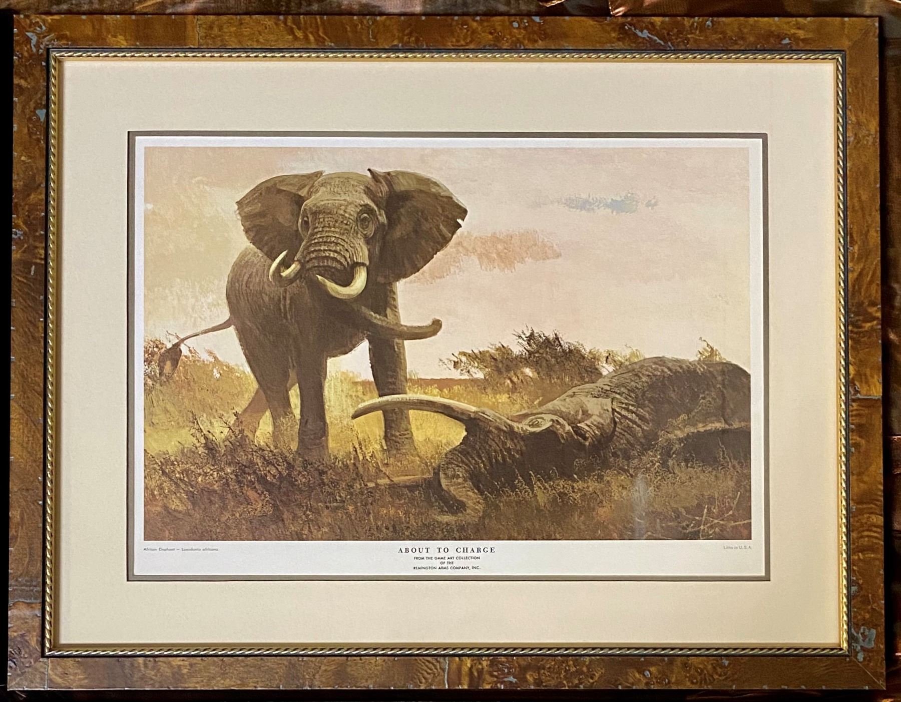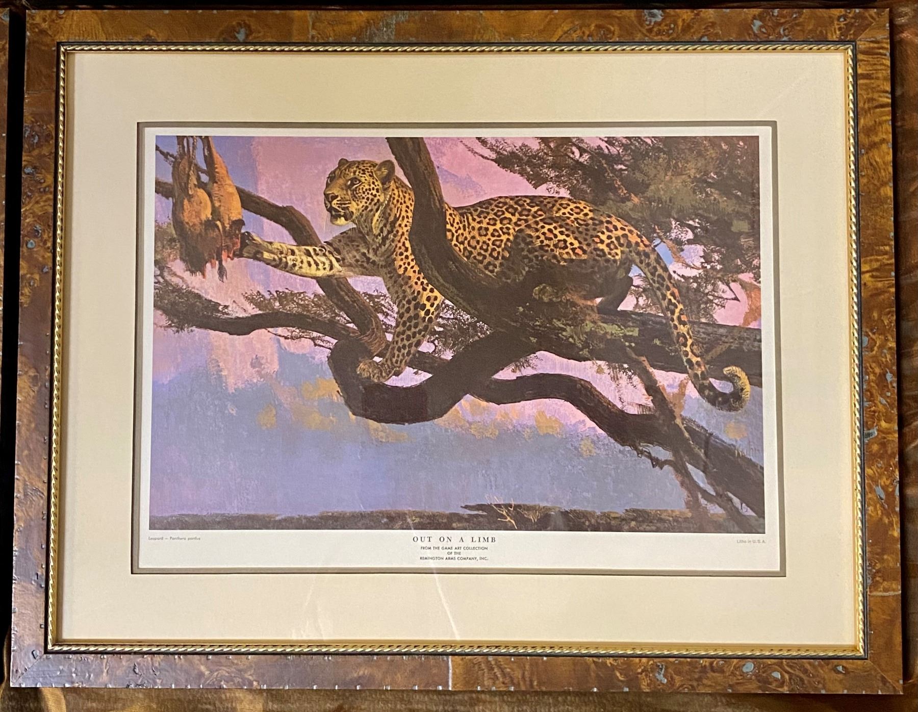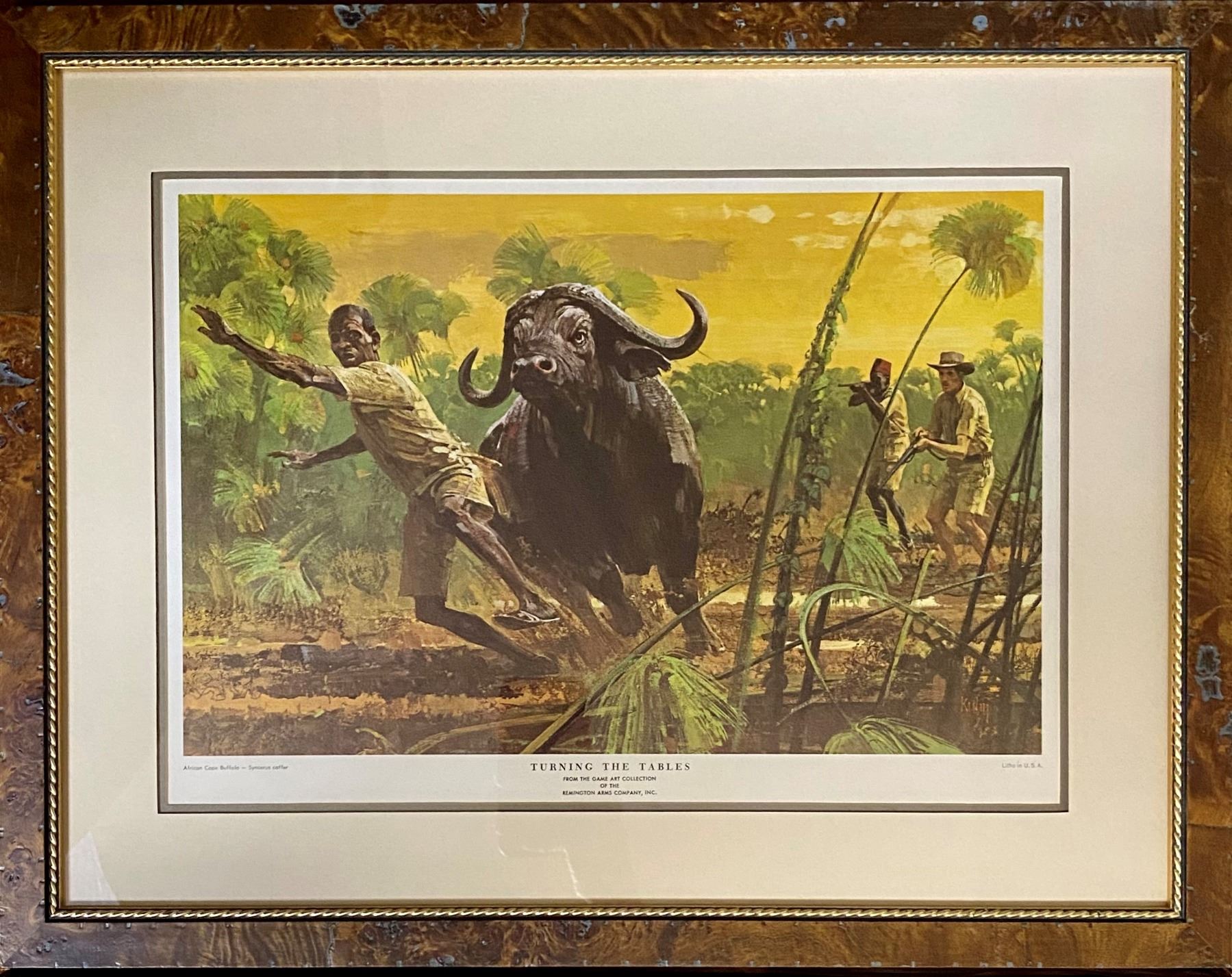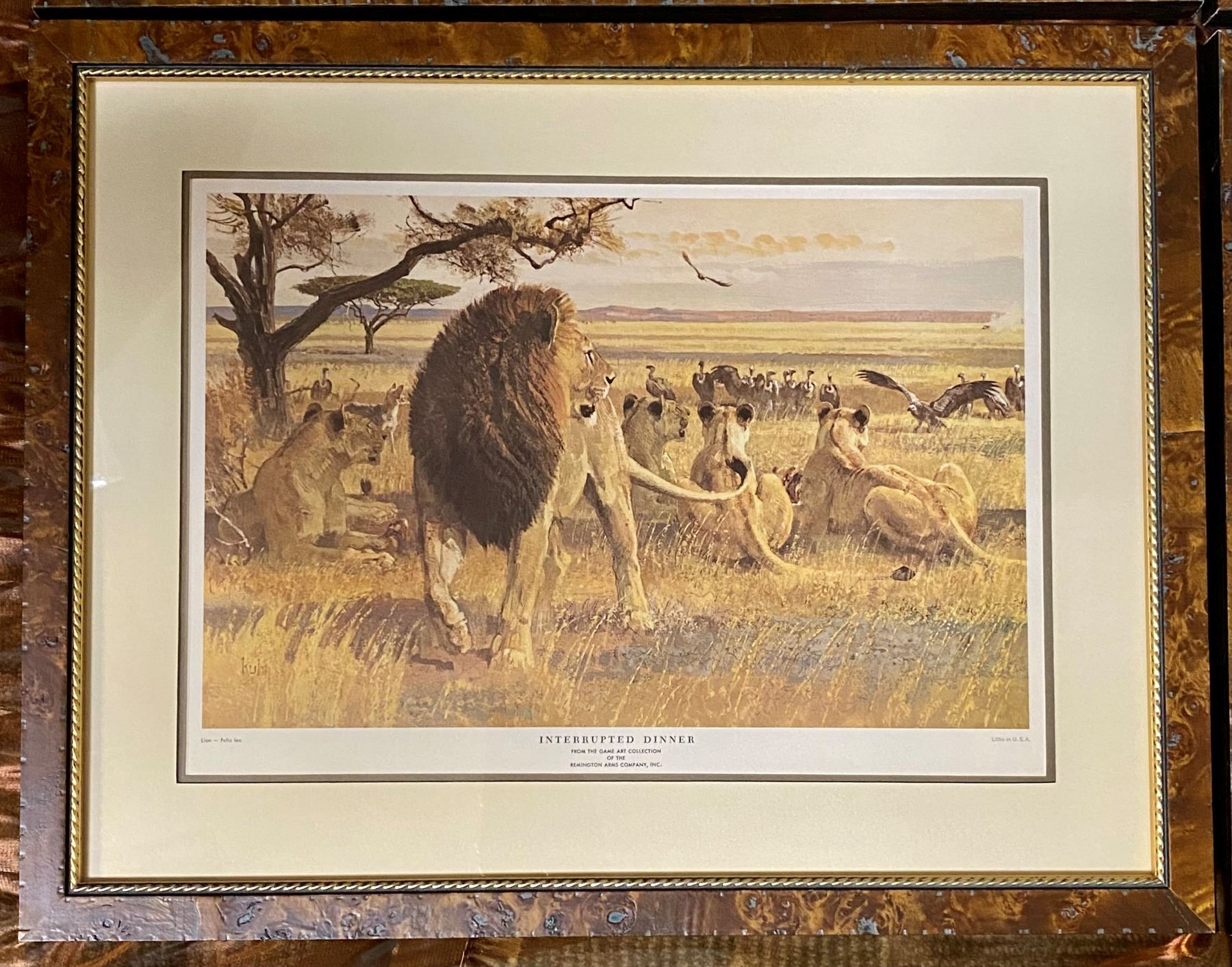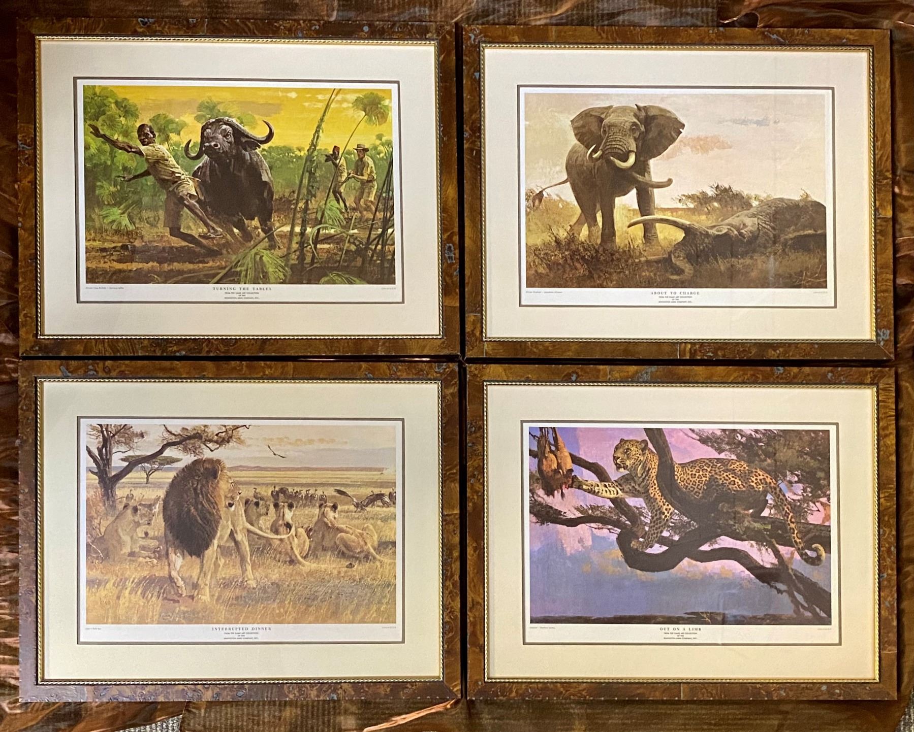 Set of four professional, beautifully framed dangerous game lithograph prints by Bob Kuhn, dating back to the 1950's-1960's. Set includes "Out On A Limb" leopard, "Turning The Tables" Cape buffalo, "About To Charge" elephant and "Interrupted Dinner" lion, all from The Game Art Collection of the Remington Arms Company, Inc. DSC FOUNDATION THANKS BRIAN FIENHOLD FOR THIS 100% DONATION.