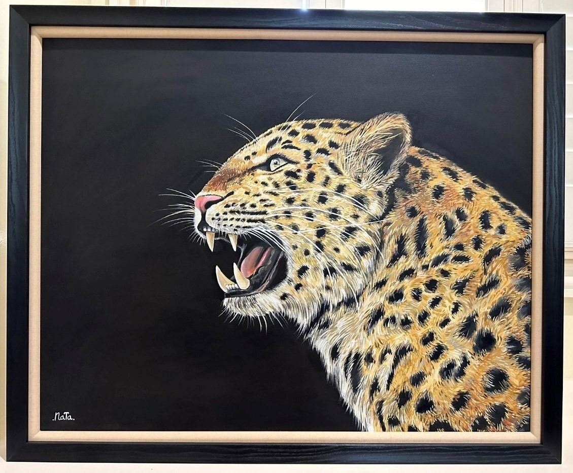 "The Death of the Kalahari" - Original oil painting by wildlife artist Natasha "Nata" Bryan, measures 32.5"x26.5" framed. Nata draws inspiration for her work in nature. A master of watercolor, oil, pastel and other painting techniques, Nata has always been fascinated by the natural world and she loves the challenge of capturing its beauty. Nata has also cultivated an interest in the fascinating world of animals and nature during her travels to various exotic corners of the world, such as South Africa and the Caribbean. "The Death of the Kalahari" painting recounts the African leopard hunting expeditions with her husband, Jason Bryan filled with 'wild adventure, cool, daring and narrow escapes from death'. A work of sport and travel, this piece describes Nata's journeys through the Kalahari Desert and Botswana exploring the lands of the Gaborone and Zambia region where she captured sketches of hippopotamus, lion, eland, leopard, rhinoceros, buffalo, kudu and giraffe. DSC FOUNDATION THANKS NATASHA BRYAN FOR THIS 100% DONATION. Natasha Bryan, natashaart2012@gmail.com.
