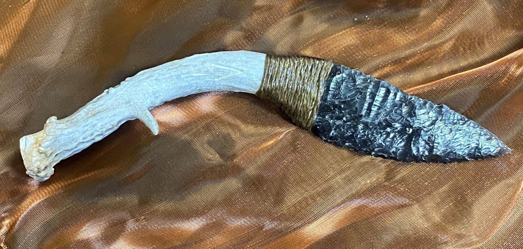 One-of-a-kind handcrafted stone bladed knife with deer antler handle, measures 12". DSC FOUNDATION THANKS RUSSELL & MARY EDITH STACY FOR THIS 100% DONATION.