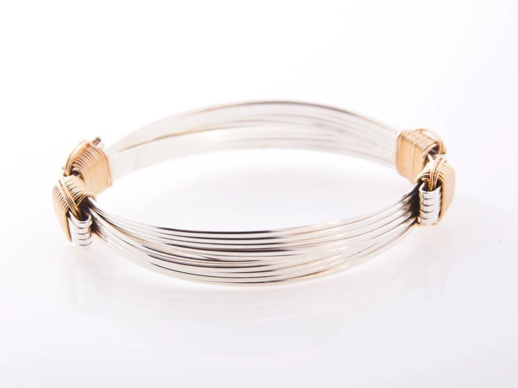 Beautiful pair of Safari Jewelry two-tone bracelets. Each includes multiple strands of 16 gauge sterling silver wire with knots made of contrasting 14k gold fill that are designed to slide making the bracelets adjustable. DSC FOUNDATION THANKS RUSSELL & MARY EDITH STACY FOR THIS 100% DONATION.